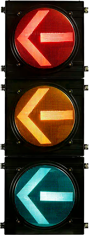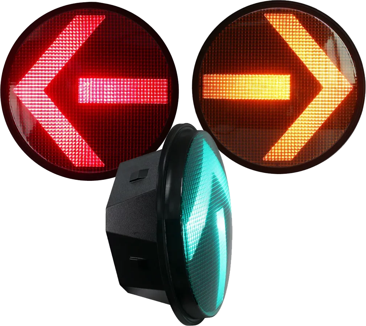 Módulos LED de flecha direccional para intersecciones complejas. Disponibles en 200mm y 300mm con orientaciones izquierda, derecha, recto y combinados según diseño de fases.