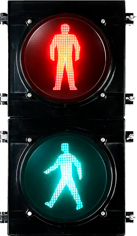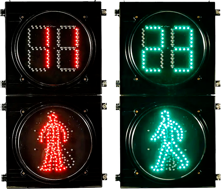 Módulos peatonales con figura humana estática y dinámica con cuenta regresiva. Disponibles con módulo acústico y botón de solicitud de paso para cumplimiento de accesibilidad universal.
